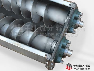 雙軸螺旋輸送機基于LS螺旋輸送機,是在U型槽內分別裝有一根實體螺旋,其中一根是左旋,另一根是右旋。工作時兩根螺旋通過在軸伸位置的一對齒輪嚙合轉動,由于螺旋體的轉動,使物料作軸向移動,從而達到輸送目的。